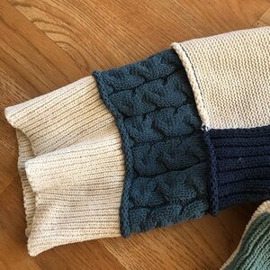 Stylish colorblock knit hoodie with a cozy design. Features cream, blue, and green panels.