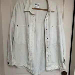 cotton jacket, denim feel, snap closure, oversized, neutral tone, casual outerwear, lightweight, minimal stain, 90s style, everyday wardrobe