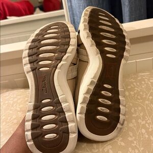 Up for sale pair beige Clarks Teagan Step Leather Women Sandals Sneakers Shoes with a sleek design. Great per owned condition. NOTE: small scuff mark front toe of right shoe-PLEASE SEE ALL PICTURES! Elastic stretch at back strap, Velcro side closure. Perfect for everyday wear.