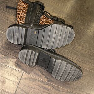 Stylish combat boots with geometric orange pattern. Durable black leather. Lace-up design with rugged sole.