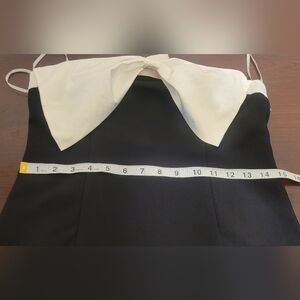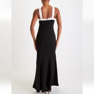 nwot Black and White Bow Mermaid Maxi Dress! This crepe knit dress falls from white satin tank straps into an apron neckline, with a dramatic bow detail, that tops a fitted bodice. The figure-skimming silhouette continues into a flattering mermaid maxi skirt with a thigh-high side slit. Hidden back zipper/clasp