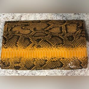 Joan Rivers Stylish coral bag Features a gold charm detail. classic vintage envelope style clutch faux snakeskin, handbag, yellowish, orange, black colors.12”Wide 8” Length.
