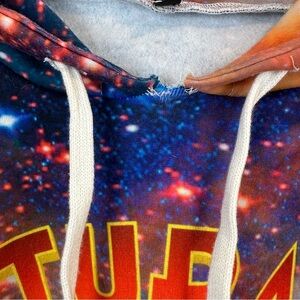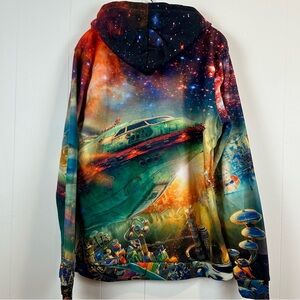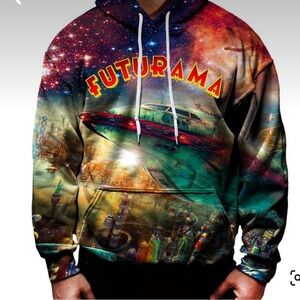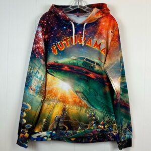 Futurama City All Over Print Hoodie Made in USA Size L. See the last photo, seam around the tie is loose. Super fast shipping from smoke free home. Reasonable offers always welcome. Approximate measurements: