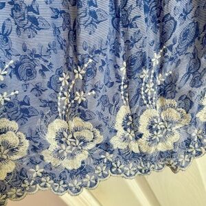 Elegant strapless dress in a floral blue pattern. Features a ruched bodice and lace hem detailing. Zipper back with hook and eye. The fabric has a slight stretch.