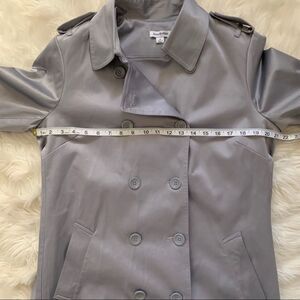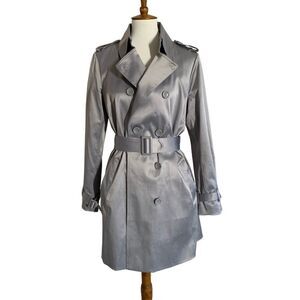 Features: Gray silver sheen outer w/ leopard interior! breasted style, button-front closure, pockets, collar, long sleeves w/ belt, belt loops & separate belt.