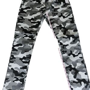Stylish camouflage stretch skinny jeans. Features a classic camo pattern in shades of black, gray, and white.