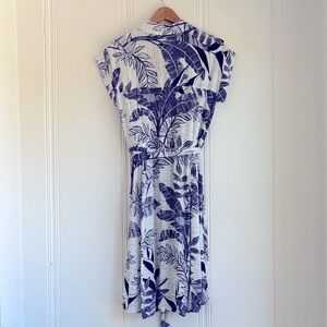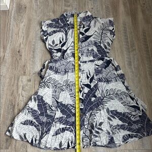 Stylish palm leaf, bird of paradise print design. Collared, button front, tie waist. Pockets. Light and breezy.