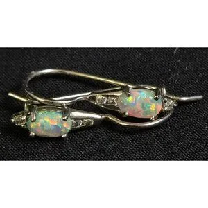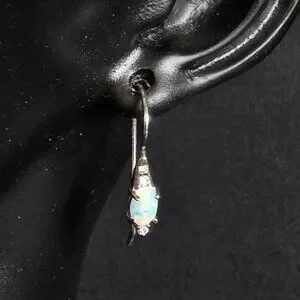 Elegant, delicate sterling silver drop earrings featuring oval white opals that glow with soft fire, accented by sparkling cubic zirconia stones above and below. The sleek, curved design gives them a refined, graceful silhouette. Perfect for everyday wear or dressy occasions.