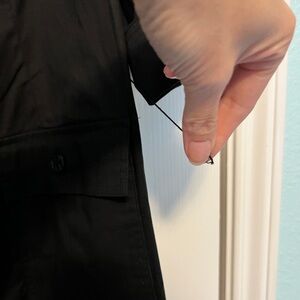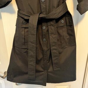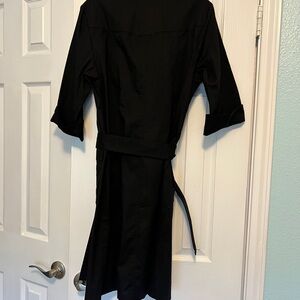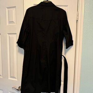 Stylish black button-up shirt dress with a tie waist and front pockets. Perfect for any occasion.