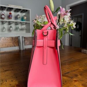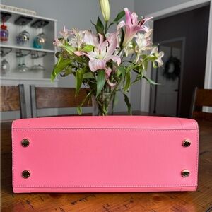 Add a pop of color to your wardrobe with this chic and structured Michael Kors satchel. Crafted from durable Saffiano leather with gold-tone hardware, this bag combines elegance and practicality. It features dual top handles, a spacious interior, and the signature MK logo charm. Perfect for everyday wear or special occasions!