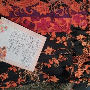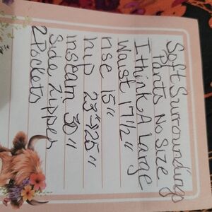 Soft surrounding pants, side, zipper no size.I think it may be a size large Very colorful pants the print is beautiful. there are pockets. EUC B62