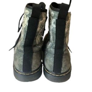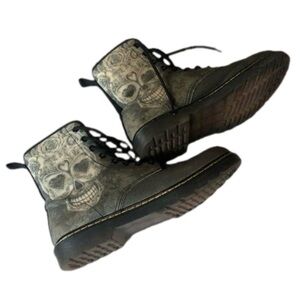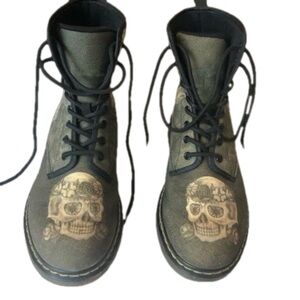 Unbranded combat style boots with sugar skulls. Green with black laces. Rubber soles. Very good preowned condition, only a few signs of normal wear (minor pulling inside, minor scuffs-see pictures). Unisex. Women’s Size 11. Men’s Size 8.5