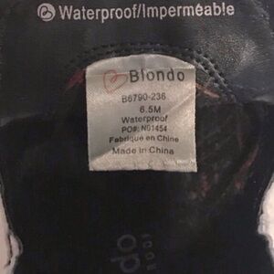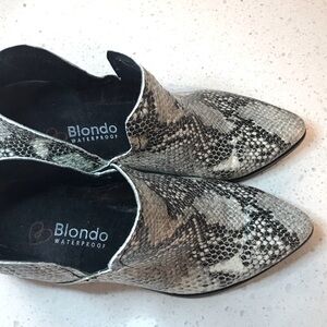 Women’s BLONDO Brand Eliza Waterproof Black & Gray Snakeskin Print Leather Vamp Pointed Toe Chelsea-style Cut Out Ankle Booties with block heels & back zipper in size 6.5 in excellent pre-owned condition.