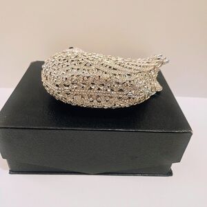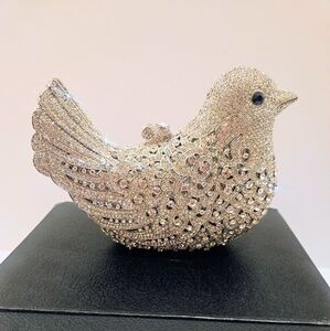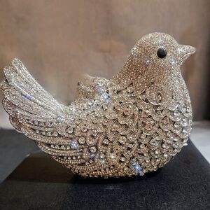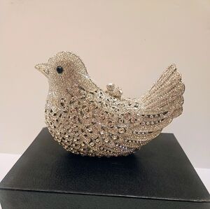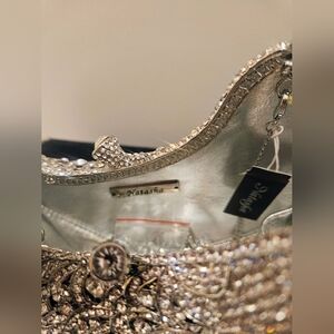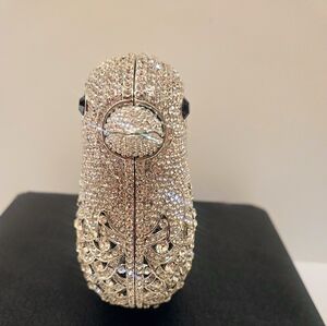 Stunning purse with intricate crystal rhinestone detailing. Ideal for elegant events. Includes detachable silver chain strap. A versatile statement piece.