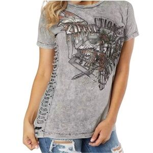 Affliction Roadie Split T Shirt Women's Size Small with Tieup Back. Fun Flirty