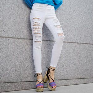 Shredded holes and fraying give these curve-highlighting denim skimmers the look of favorites you've worn and loved for years.