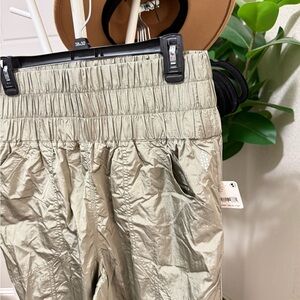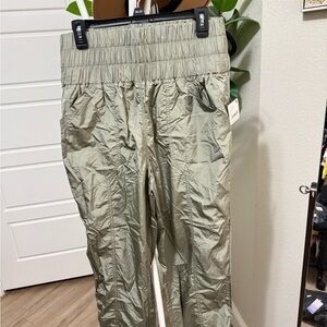 Stylish olive green jogger pants with elastic waistband and cuffs. Perfect for casual wear.