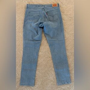 Levi’s women's skinny blue jeans. These jeans offer a flattering fit and versatile style. Material has nice stretch. 59% cotton, 21% viscose, 18% polyester, 2% elastane.
