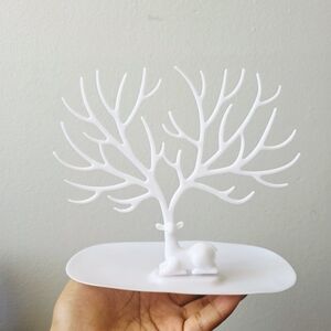 Elegant white jewelry holder shaped like a tree with a deer base. Perfect for organizing accessories.