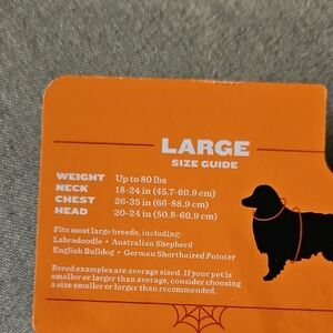 Dress your dog in this festive Halloween sweater featuring vibrant orange, white, and black colors. Perfect for adding a spooky touch to your pet's wardrobe. See measurements in photo off package.