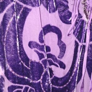 Chic purple velvet blouse with ornate designs. Features a tie-front and ruffled hem. Ideal for a stylish look.