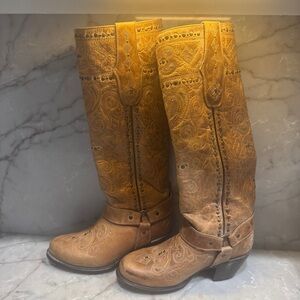 Sophisticated Coach shoulder bag in black and cream. Features signature pattern and elegant buckle detail.