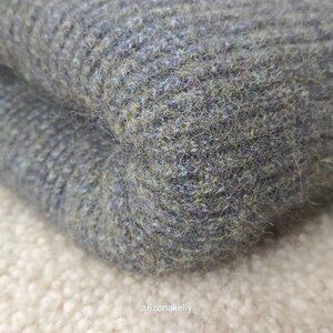 Thick, soft, and fuzzy. Appears totally unworn with no damage, pilling, pet hair, or odor. Interesting color--appears grey at first glance, but it's actually a birdseye knit with grey and green.