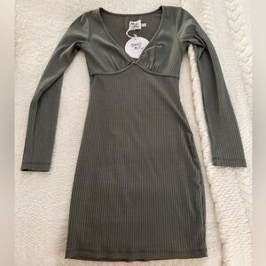 Versatile soft ribbed mini dresss with long sleeves and v cut neckline in a soft sage hue. Can dress up or down!