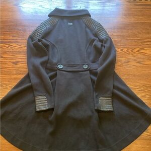Stylish Harley Davidson Women’s Peacoat. Double-breasted button front design. Decorative button back waist. Features ribbed leather look trim on shoulders and cuff details. High low peplum hem. Metal badge on back neck. Perfect for winter.