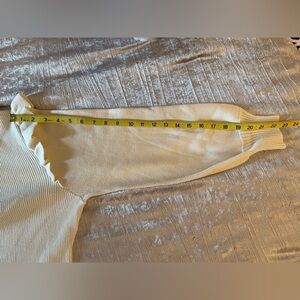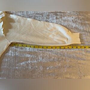 Never worn. Super cute cream colored sweater dress. Will totally transport you to the ‘80’s. Made from a luxurious blend, the dress is crafted from soft, skin-friendly, and stretchy knit fabric with vertical ribbed texturing. Perfect for staying cozy, and comfortable at every event. Features a chic mock neckline, long puff sleeves with ruffle shoulders and fitted cuffs, and a flattering bodycon silhouette that ends in a mid-thigh length hemline. Stay stylish and warm all season long in this adorable retro looking sweater dress.