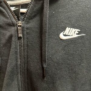 Classic black zip-up sweater by Nike. Features front pockets and iconic logo. Ideal for everyday wear.