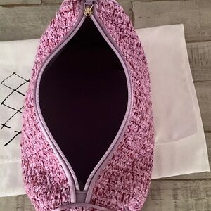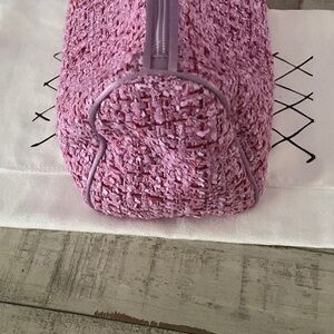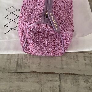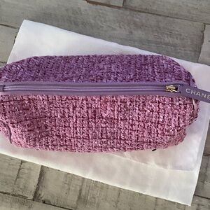 Chanel tweed pouch in vibrant pink. Features a zipper closure. Ideal for storing essentials. This is from the 2020 Chanel spring/summer collection and came with a pair of flip flops/sandals. Last picture is for reference only this listing does not come with the shoes.