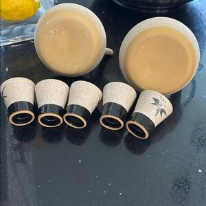 The design on the set features a speckled, textured glaze with a black and white painted motif, which appears to be bamboo.