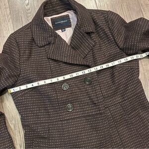 • Features: Fully lined wool blend pea coat in a dark brown with pink accents