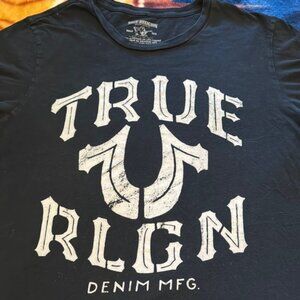 This True Religion black short sleeve tee features a striking varsity-style graphic design, including the iconic 'TRUE RLGN' text and a distinctive horseshoe motif. Crafted from quality fabric, this shirt offers a comfortable fit and a stylish look, perfect for casual outings.#8