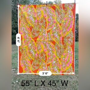 Vintage fabric in “like new” condition, ready for your crafting or sewing project…the sky is the limit! 45” X 55”. Bring yourself back to the 1960s or early 1970s with this psychedelic combination of bright colors: bright fuchsia pink, deep orange, bright yellow, and light olive green. I believe the fiber content is a cotton/polyester blend, therefore this fabric is crisp but not super stiff. This is a fairly straight cut of fabric. The edges on the length with the white strip are what is called selvage edge, or factory edge. The edges on the width, pictured on top and bottom in the photo of the fabric on the clothesline, have been turned and casually hemmed, with a zig stitch, likely intended to prevent fraying. This is a generous sized piece of fabric: see photo (Digital measurements are not as accurate and actual measurements are printed below on the photo and listed above.) This fabric could have so many uses: tablecloth, small curtain, throw pillow covers, a seamstress’ delight for making a vintage style costume or some funky clothing! Comes from a pet free and smoke free home. Thanks for looking! 🩷🧡💛💚