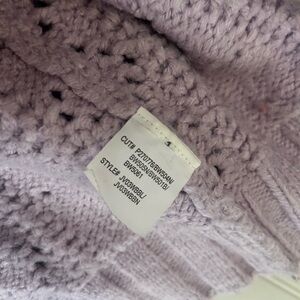 Chic lilac cardigan with open-knit design. Perfect for layering. Soft and comfortable.