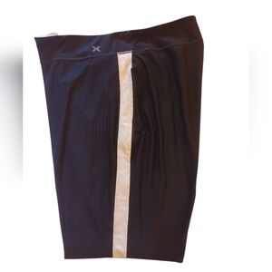 * semi-fitted wide leg yoga pants, black with white stripe down outside leg, size XL but fits very loosely, (see pics for measurements, waist 19", hips 22", inseam 30.5")