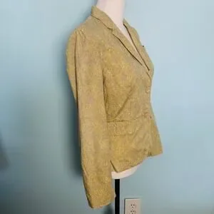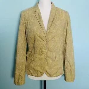 A lovely cotton blazer in a yellow and pink paisley and floral print. Two button front with faux flap pockets and elastic across the back for a fitted look. Wear it to work with pants or a skirt or go casual paired with jeans or shorts! Lined. In excellent used condition