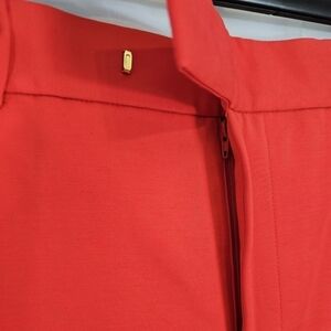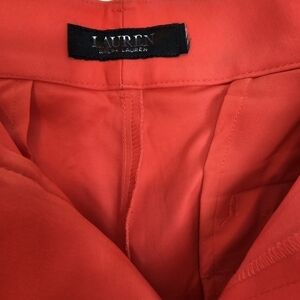 NWOT Lauren by Ralph Lauren Size 14 bright Coral high waist shorts with cuff at seam. No pockets, side sewn, and one back pocket is welt. The right rear pocket is open with a button closure. So, one actual pocket! Open belt loops with zipper, button closure, and hook. Size tag and materials tag have been removed.