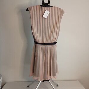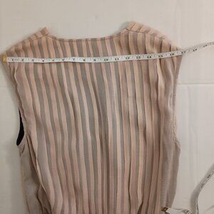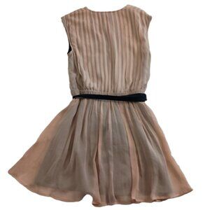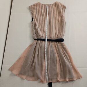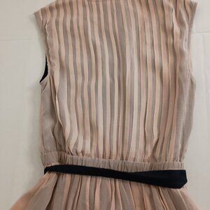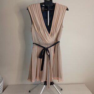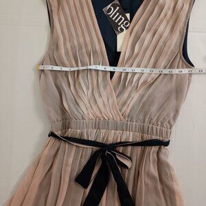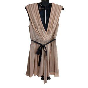 Elegant and chic pleated silk belted dress by MM Couture in tan and black. Features a flattering V-neckline, soft lightweight silk fabric, and a classic silhouette perfect for both day and evening occasions. Women’s size Large. New with tags and in excellent condition.