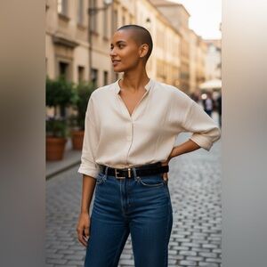 Chic black belt. Features a stylish gold buckle. Ideal for versatile wear.