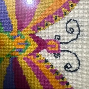 This product is a beautiful handmade framed needlepoint featuring a colorful vintage glass design of a butterfly. The piece of cross-stitch art is crafted in the United States, adding to its unique and authentic charm. The intricate details of the embroidery, combined with the vibrant colors and vintage aesthetic, make this a stunning and eye-catching piece for any home decor or as a thoughtful gift for a butterfly lover.