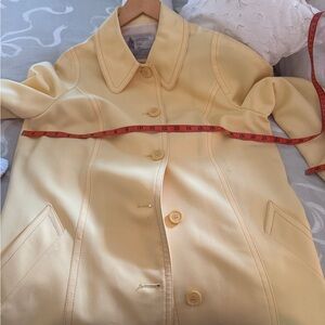 Chic light yellow lined trench coat. Features classic button closure. Perfect for any occasion.