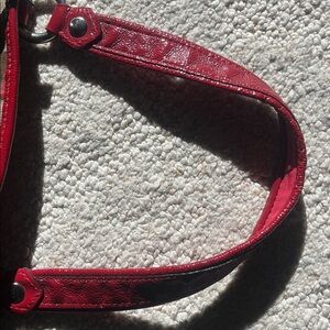 Stylish Coach shoulder bag in red and tan. Signature canvas design. Perfect for everyday use.