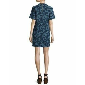 Rag & Bone “Esmond” dress featuring laser-cut motifs, a crew neckline, short sleeves, and a slim silhouette. Designed with a partial back zip and a hem that falls to mid-thigh. Made from cotton in the USA, this dress comes in blue, size large. Retail price $495.00, brand new with tags.
