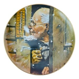 Charming plate with a winter scene by Norman Rockwell. Features a man peeking out in the snow. Rich brown and cream tones. Ideal for collectors.