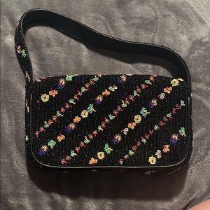 Chic black shoulder bag with vibrant floral beadwork. Ideal for stylish outings.