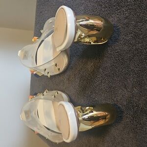 Elevate your look with these chic transparent heels. Adorned with colorful studs and a striking gold heel, they add a touch of glamour to any ensemble. size 7..no box...2 bags..never worn