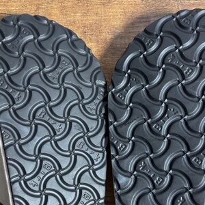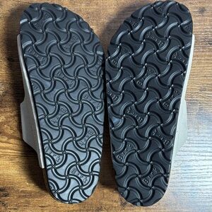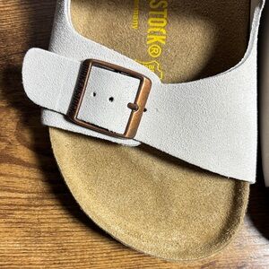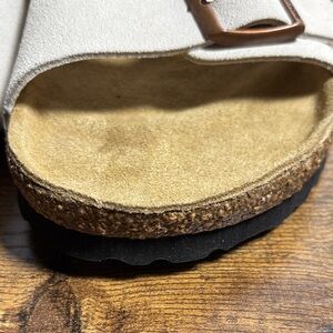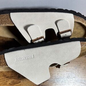 Classic Birkenstock sandals. Cream straps with adjustable brown buckles. Comfortable footbed for all-day wear.